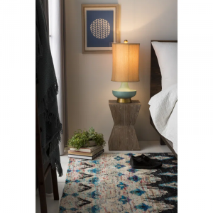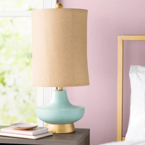 This table lamp adds a pop of color and a warm glow to your space with its striking turquoise hue and ambient lighting. The curving, vase-like silhouette is set on a round, gold-finished matte base, topped with a golden finial for a touch of elegance. The elongated linen shade in a camel hue complements the lamp’s vibrant body, creating a balanced look. With a 3-way switch located at the socket, you can easily adjust the lighting to suit your mood or activity. Just plug it in, and you’re ready to light up your living room or bedroom.