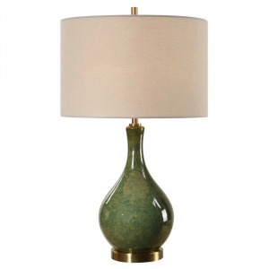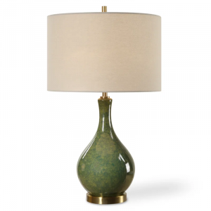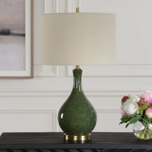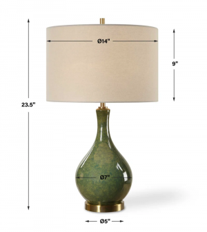 This elegant ceramic table lamp is finished in a distressed emerald green glaze that’s also glossy for a polished vibe we love. It features antique brass accents to bring a modern glam touch to the overall design. A beige linen drum shade rests on top and filters the ambient glow from a 100W max bulb, which is sold separately and controlled by a handy on-off switch. At 23.5″ tall and 14″ wide, this lamp is a great accent for end tables and entryway consoles.