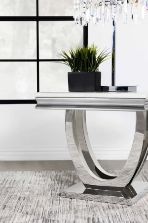 This end table combines modern glam and functional elegance with a sintered stone top featuring a marble-like appearance and beveled edges. Its sweeping demilune pedestal base in polished stainless steel provides stability while enhancing the sleek, contemporary aesthetic. Contoured molding adds an extra touch of refinement, making this ultra-modern piece a perfect addition to any sophisticated living space.