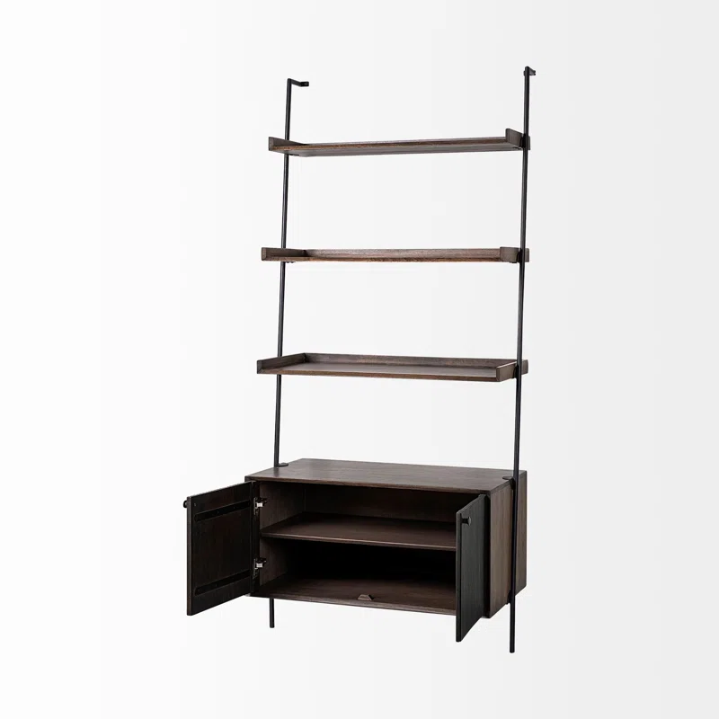 With a nod to mid-century modern style, this iron ladder bookcase brings warm wood tones and clean lines to your space. Crafted from solid Indian mango wood, this ladder-style shelving unit is finished in a two-tone palette. The three display shelves are finished in a medium brown hue, while the cabinet complements with a dark brown tone. The cabinet features soft-closing, shutter-inspired doors that reveal two shelves of concealed storage space. An iron frame braces the open shelving and cabinet to provide both stabilization and visual appeal. The three shelves are removable and offer ample storage space. Partial assembly required. All tools included.