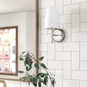This classic 1-light armed sconce offers ambient lighting that’s just right for your bedroom, hallway, or entryway. Crafted from steel, it’s mounted on a circular metal backplate with the metallic finish of your choice, so it’s easy to incorporate into your existing style or color palette. The white glass empire shade diffuses light from a single bulb (sold separately). For added versatility, this sconce boasts dimmer switch compatibility, and it’s rated safe to use in damp locations like bathrooms or kitchens.