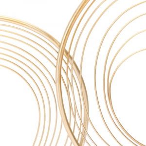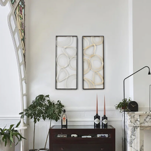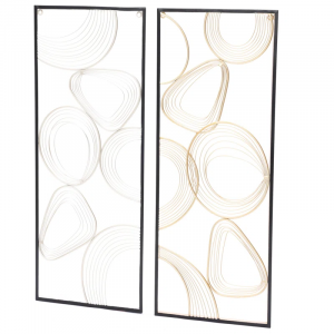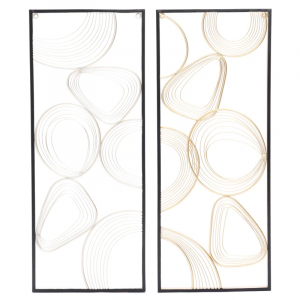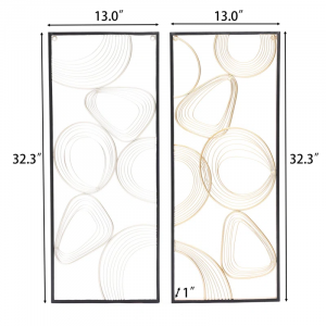 Arriving as a 2-piece set, this wall decor brings a sense of movement and fluidity to your space while filling it with plenty of glam style. Made from metal, it features looping and interwoven metallic rings and lines (one silver-finished and the other gold-finished) to create an eye-catching focal point in any room. Black rectangular frames hold the abstract patterns firmly in place to complete this open, airy design. Each panel measures 32.3″ tall and 13″ wide, and they can be mounted separately or together depending on your preference. Bonus: Hardware is included.