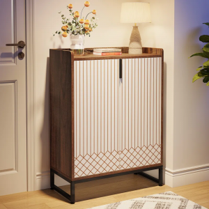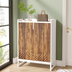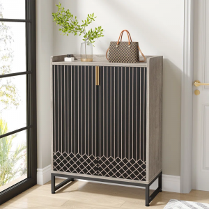 This freestanding shoe cabinet is the perfect spot to organize and store away your high heels, flats, and boots. With a 5-tier shelf, there’s enough storage space to accommodate 20 pairs of shoes. The surface on the top is ideal for keeping decorative items and a small potted plant. Or keep your quick-grab items close at hand, ready for when you’re heading out the door. Crafted from engineered wood, this cabinet comes in a two-toned color scheme with a geometric design, and it rests on an open metal sled base for extra modern vibes.