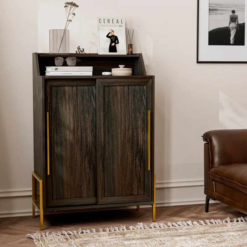Meet the freestanding cabinet, an elegant and versatile addition to your home. Constructed from robust manufactured wood for durability, it features an intelligent design with adjustable shelves and sliding doors, allowing for custom storage. Each shelf can carry up to 20 pounds, the rack top can hold up to 40 pounds, and the hutch up to 15 pounds. Along with a 4-tier shoe rack, the cabinet also includes an additional open shelf, ensuring ample space for shoes and accessories. Despite its generous storage, it sports a compact footprint, measuring 15.7″(D) x 30.9″(W) x 45″(H), making it the perfect fit for any room.