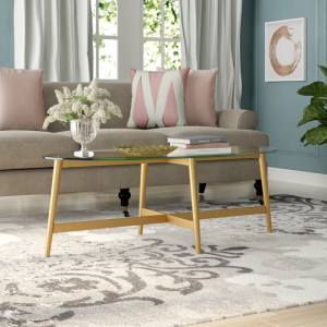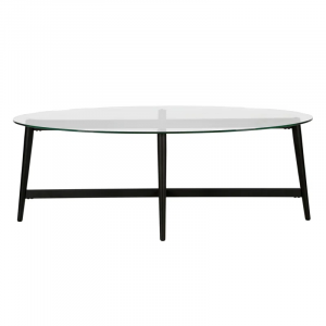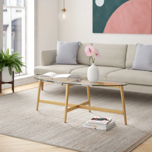 This mid-century-inspired coffee table adds a sleek and streamlined look to your living room. Its minimal frame showcases flared legs and a lower cross support with a satin gold finish, creating an elegant design. The oval table top is made from clear tempered glass, providing an easy-to-clean surface for snacks, drinks, and remotes. Designed to blend with various decor styles, this coffee table is a versatile addition to your space. Plus, with a weight capacity of 50 lbs., it’s ready to hold your favorite decor pieces and essentials.
