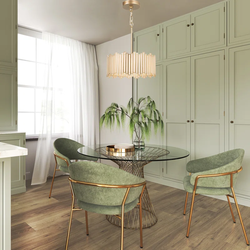 As much an Atchison art piece as it is a source of light, this four-light drum small chandelier is sure to collect compliments as it illuminates any arrangement in your home. Crafted from metal, this fixture features a drum shade composed of open slats at irregular heights in a finish for a glint of glamour. The metal edging of glass for a delicate look is handcrafted with the devoted effort that is for a chic aesthetic. The drum shade and bright frame elevate elegant modern flair while enhancing comfort in your space. This small chandelier is perfect to suspend alone above your breakfast table or small nooks like your home office, or entryway or you could suspend a pair above your large dining table or kitchen island.