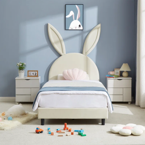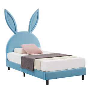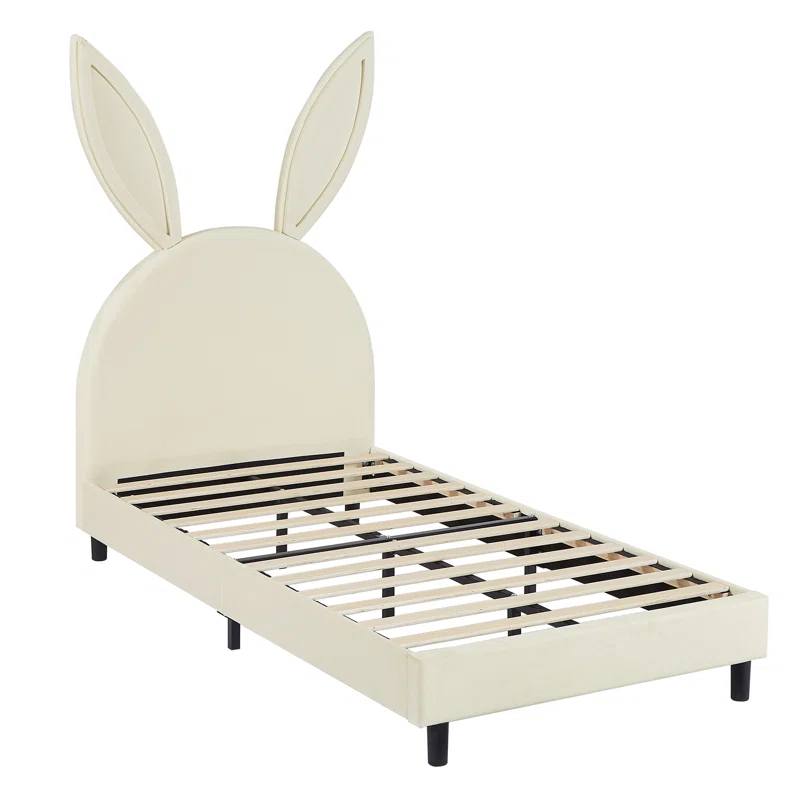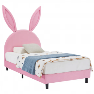 This twin bed brings a playful touch to your child’s bedroom with its delightful rabbit-shaped headboard. Upholstered in soft velvet, it offers a cozy backrest that’s both cute and practical for bedtime stories or lounging. The bed’s slatted frame is crafted from a mix of plywood and steel, providing a reliable foundation for restful nights. With 12 included slats, there’s no need for a box spring, making setup a breeze. This bed is a fun addition to any kid’s room, adding a dash of whimsy and comfort.