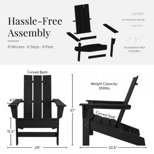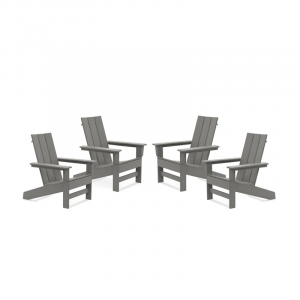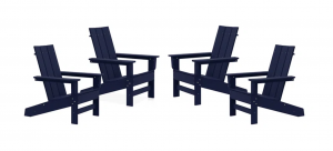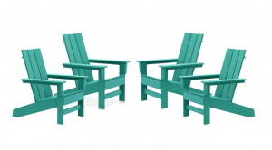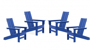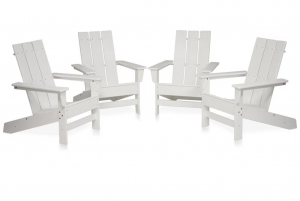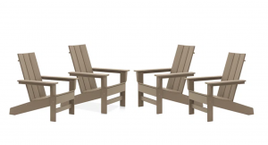 Outdoor get-together. These angular Adirondack chairs come in lots of colors, so you can brighten your backyard or keep things earthy. They’re made from weather-resistant resin that mimics the look of wood but stands up to the elements year-round. Set of four – just add a fire pit + acoustic guitar.