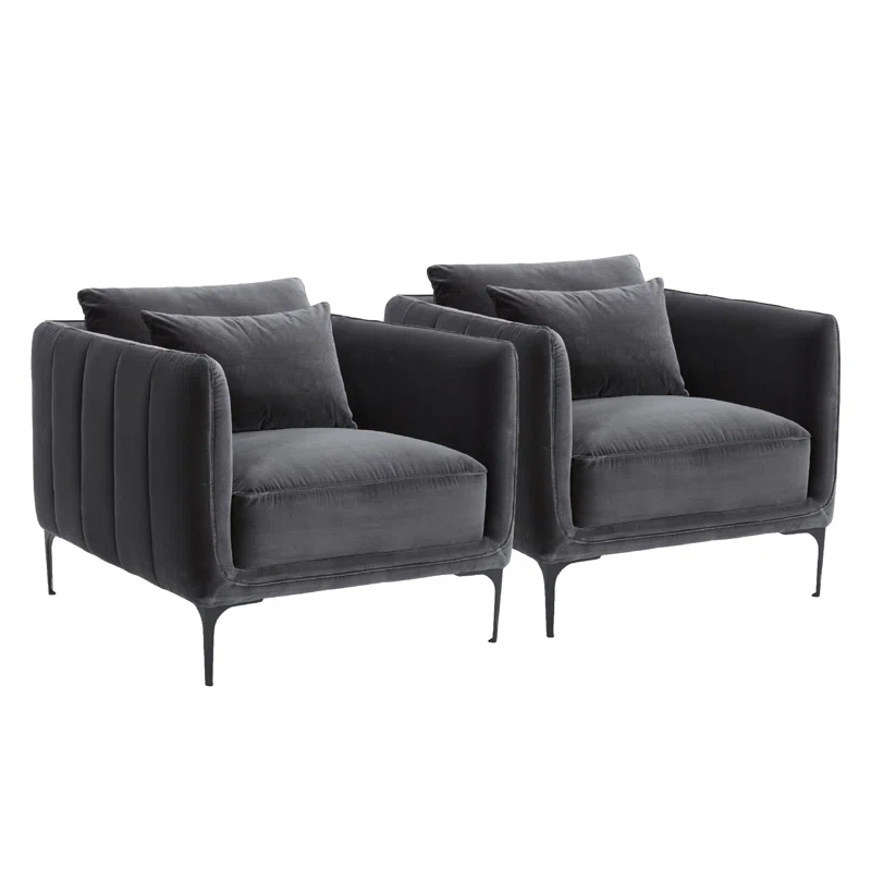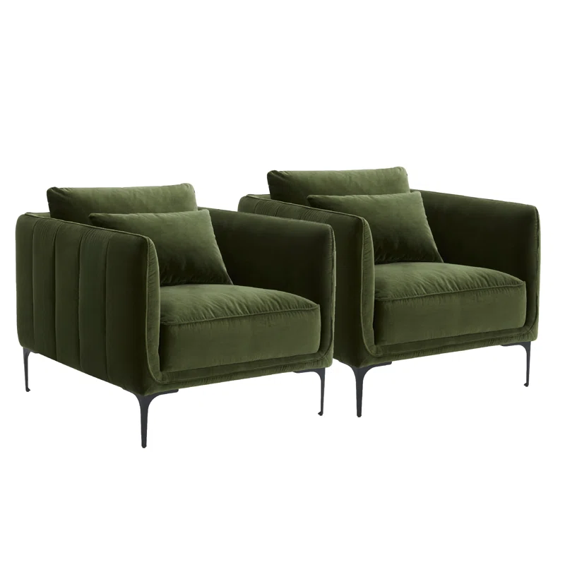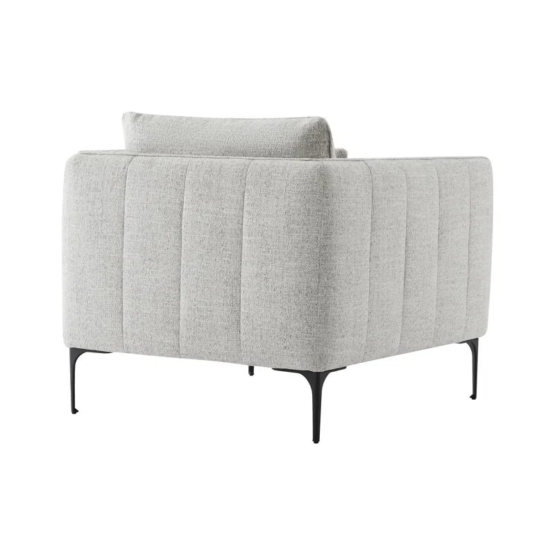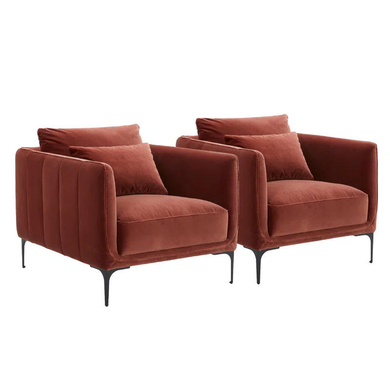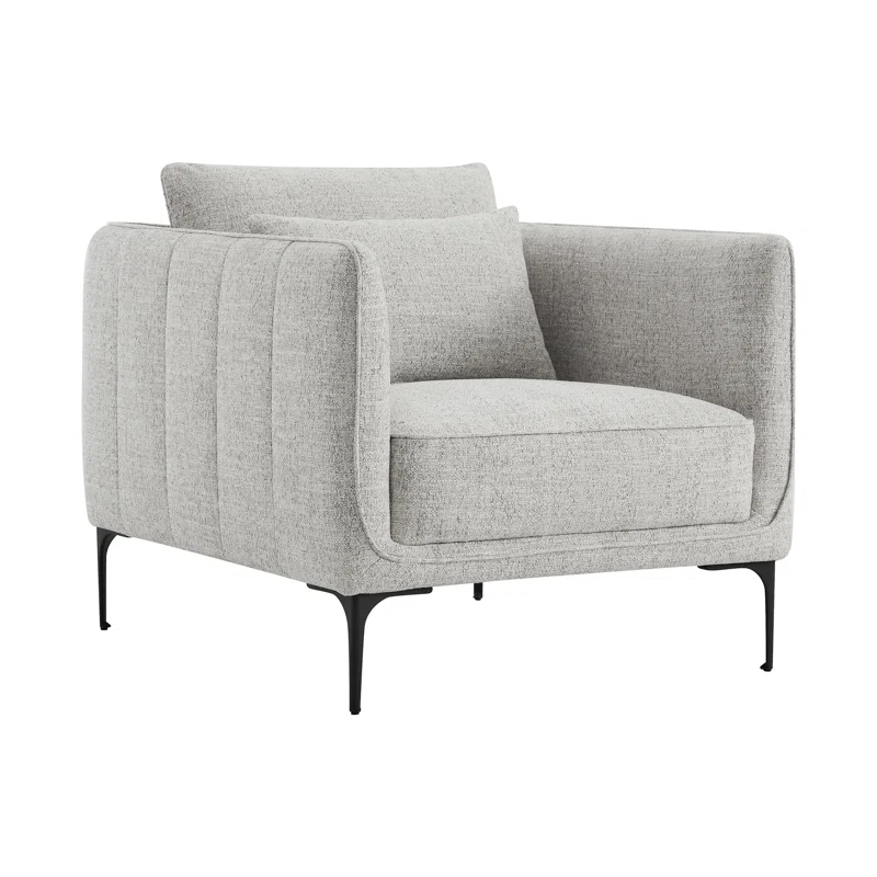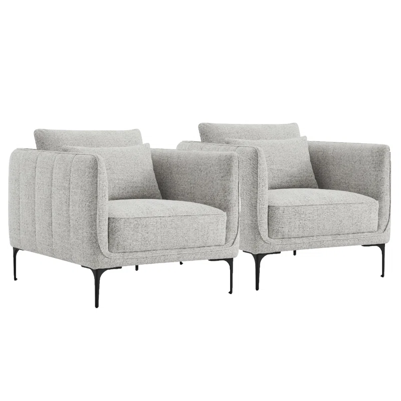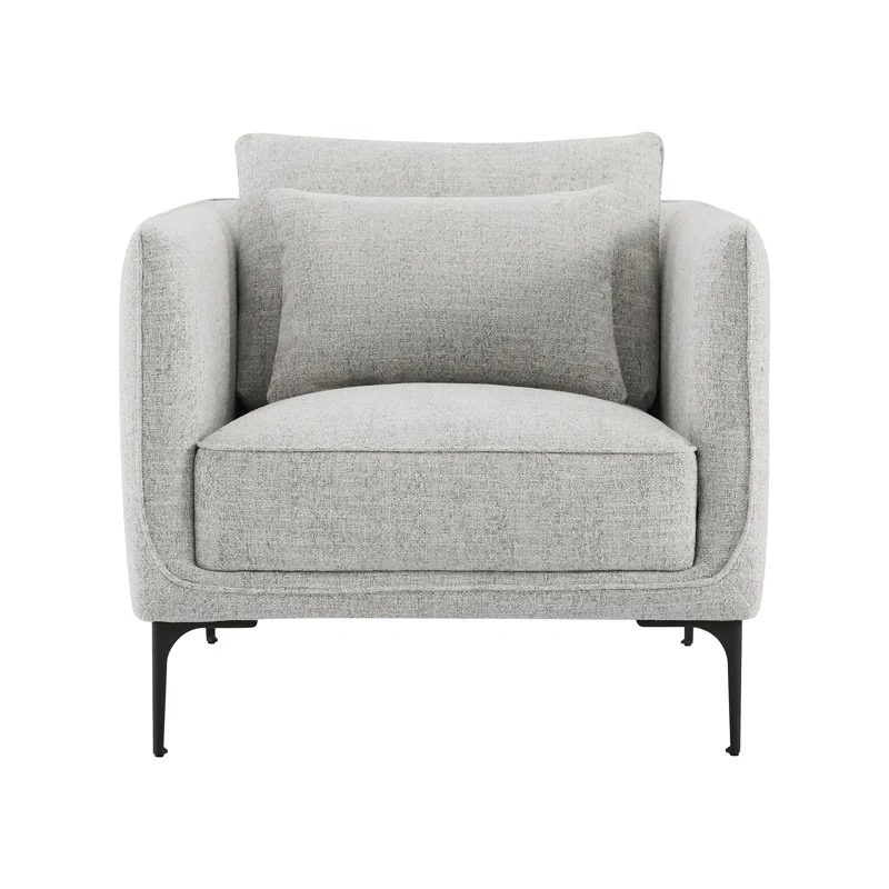 Elevate your conversation space with this inviting armchair. It has a modern silhouette, with square arms, bracket legs – and it’s available in any array of linen, cotton, polyester, and blended upholstery options. The feather blend fill and sinuous springs construction ensures comfort and stability. Plus, it’s water-resistant, so it’s a good choice for busy rooms and active homes.