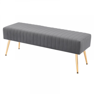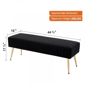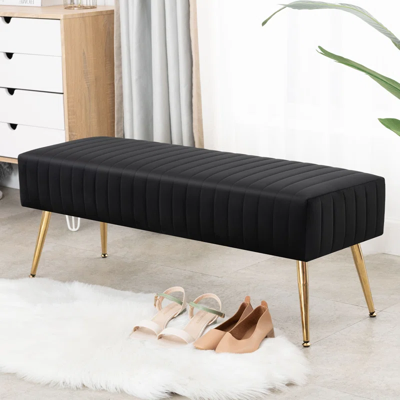 Luxuriously upholstered in plush velvet, this 44” bench brings textured sophistication to entryways, bedrooms, or living areas. Its cushioned top is filled with dense foam for firm yet inviting support, making it ideal for putting on shoes or taking a moment’s pause. Supported by sleek gold-finished metal legs, it offers sturdy balance while the vintage-style pleated seat top adds a refined decorative touch. We love that its compact, guest-ready design slides effortlessly into varied spaces while delivering an upscale, tactile accent.