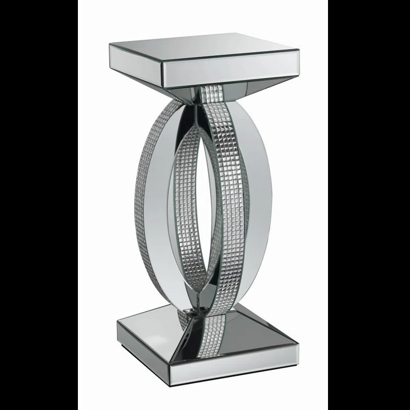 Sleek and contemporary, this end table adds an artistic edge to your living room decor. Its tapered square base forms a sturdy foundation for such a glam-inspired design. Four bold, C-shaped supports fuse together to form a sculptural silhouette with a similarly tapered top. It’s crafted from glass and covered on all sides by beveled mirrors for a flashy look that stands out. Plus, textured silver accents on some of the surfaces add a dash of dimension. Measuring 12″ square, this table’s minimal footprint makes it ideal for smaller spaces.