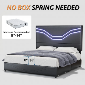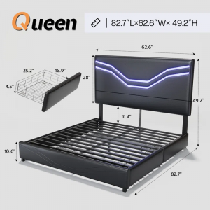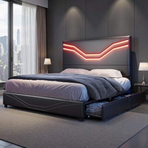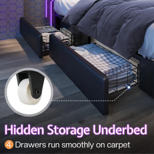 Bed Frame with LED Lights and Storage Drawers, Adjustable Leather Upholstered Headboard, No Box Spring Needed, Platform Bed for Smart Bedroom Decor