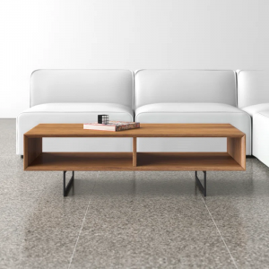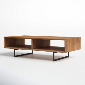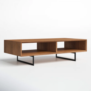 Function-forward forms. With its wood grain finish + black steel sled legs, this coffee table showcases a sleek mixed-material look that draws on industrial design. Two open storage compartments keep books + remotes close at hand while the surface stays clutter-free.