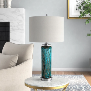 Draw the eye towards your luminary ensemble with this distinctive 29.75″ table lamp, a charming addition to your stylish abode. Defined by a glass base decorated with raised details, this blue, and gold design is sure to spark conversation. This table lamp’s linen drum shade adds a familiar style to any space, while its brushed nickel-plated details bring a shimmering style to your favorite color palette. Play up this piece’s versatility by adding it to a casual coastal living room, dressed up with decor to bring you back to your favorite Cape Cod beach or tranquil shoreline getaway. Perfect for casting a warm glow over your favorite reading nook or family game night, this sleek luminary is sure to spark conversation in your stylish abode.